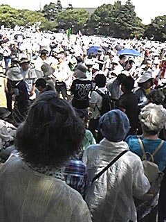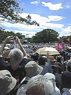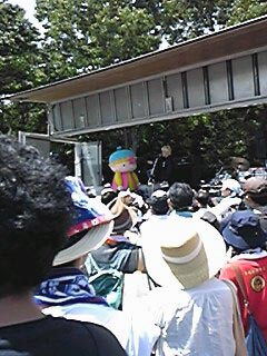 炎天下、それ以上の熱気をもちよった人々。メイン会場中心に、後から後から人が押し寄せます。“生もんじゅ君” も参加(カワイイ!)。