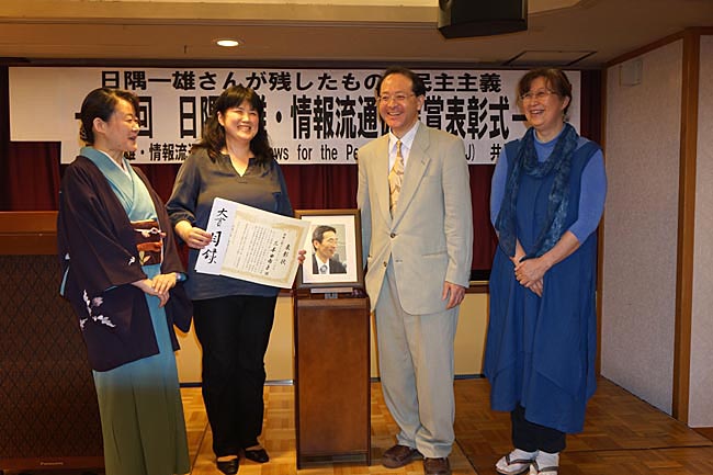 日隅一雄さんが残したものと民主主義 ―第1回 日隅一雄・情報流通促進賞表彰式― 第1回 「日隅一雄・情報流通促進賞」 受賞の方々 丸森あやさん、三木由希子さん、野呂法夫さん、武藤類子さん(左から) ・ 大賞 (副賞30万円) 情報公開クリアリングハウス (代表 三木由希子様) ・ 奨励賞 (副賞10万円) CRMS(市民放射能測定所) (代表 丸森あや様) 福島原発告訴団 (代表 武藤類子様) ・ 特別賞 東京新聞 「こちら特報部」 (代表 野呂法夫様) 情報公開クリアリングハウス 三木由希子さんの受賞あいさつ ●主催 日隅一雄・情報流通促進基金 ●共催 NPJ (News for the People in Japan) 【問い合わせ先】 東京千代田法律事務所 TEL03-3255-8877