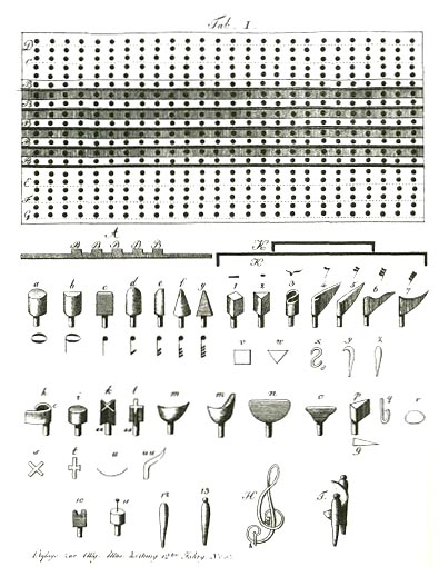 リーディンガー考案の点字楽譜板 (1810年、“音楽一般新聞” 掲載)