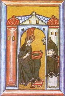 音楽の世界でも、ドイツの女性宗教家・神秘家で女子修道院長でもあったヒルデガルト・フォン・ビンゲン(1098−1179、 図版1)の聖歌に、