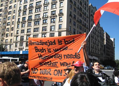 「この大統領はホロコースト (ユダヤ虐殺) は神話だと言った」 とのポスターから、ブッシュ批判・戦争反対のチラシまで、その主張は見事に様々な方向からなされていた。
