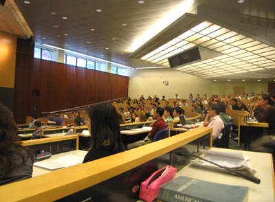 各国からの留学生に囲まれて 世界中から学生が集まるNY。(NYにも遅い春が来て、みんな陽だまりを楽しんでいる) ■世界42カ国からの学生 5月末には、ロースクール卒業である。時がたつのは早い。私の通うプログラムは、各国で法律家としての経験をもつ者が、 アメリカ人学生に混じりながら好きな分野を集中して学ぶというもので、1年で終了。1年の間、アメリカ人の友達もたくさんできたが、 日常を共にすることが多いのは世界42カ国から集まる法律家たちであった。 大教室の授業。100人くらいの授業から10人程度の授業までさまざま。概して人権関係の授業は人数が少ない。 留学生217人の構成は、日本人が33人で最大、続いて25人程の中国人、66人がヨーロッパ (ロシア・東欧からも少なくない) からで、25人がラテンアメリカ、 残りがカナダ・オセアニア含むその他の国からである (ちなみにアメリカ人学生は約1200人いる)。 年間学費だけで500万円近くかかるため、発展途上国の学生はとても少ない。 アフリカからは3人 (うち一人は南ア)、中東はパレスチナ人1人、イスラエル人11人 (!) を除いて誰もおらず、アジアも、タイ2人とインド13人以外、 発展途上国出身者はいない (ロースクールではなく、お隣の国際関係学部ではもう少しバラエティ豊かになるが。)。 たくさんの国からの留学生。文中のほか、なかなか日本では会えない国籍としては、アルバニア、セルビア、リトアニア、ボリビア、 パラグアイ、ハンガリー、ブルガリア…… アジアの学生と。東アジアの学生は英語が苦手。出身国同士で固ま りがちになり、圧倒的マジョリティなのに存在感がないという残念な状況である。 ロースクールへの留学生の多くは国際企業弁護士である。また、私のように国際人権に絞って学びたいという者も10人程いるだろうか。 さらに、裁判官、検察官、政府官僚、政治家志望者などがいる (もっとも、欧米人には、国際企業法務も人権も両方やりたいという人がとても多い。 アジア人には残念ながらあまり多くはないのだが。)。 こんな国際的な環境の中にいては、日々、興味深いことばかりおきる。 ■メイド 大の仲良しに、ベルギー人のアンがいる。国際人権に興味があり価値観を一番共有できる友人である。ある日、アンが、「聞いてよ!」 と、興奮してやってきた。 ルームメートともめているというのである。 彼女は大学の寮に住んでおり、日本風に言えば3DKマンションに学生3人で住み、一部屋ずつを一人一人の部屋にしている (NYは家賃がべらぼうに高いので、 学生の多くはアパートをシェアしている。)。アンのルームメートの一人は、南アフリカからのカレン。そのカレンがアンに、家でメイドを雇おう、と言いだしたのである。 アンは、 「人を使うなんて考えられない。アパートの部屋なんて狭くて、掃除するったって20分もかからないのに! 私たち学生だし!」 「カレンはお皿洗ったり洗濯をしたことがないんだって!」 「カレンは、“メイドも仕事が欲しいんだから、雇われて幸せなのよ” っていうのよ。でも、そういう問題じゃないと思わない?」 「でも、カレンって南アフリカの白人でしょ。だから、カレンに怒っても仕方がないんだろうけど…。」 …その後二人は、それぞれの両親に相談することにした。その結果をアンに聞くと、 「もちろん私のお母さんは、『自分の身の回りのことは自分でしなさい』 って言ったわ。『メイドなんてふざけるんじゃない』 って。 でも、カレンのお母さんは、『洗濯や掃除なんてあなたがすることないわ。メイドを雇いなさい』 って言ったの」……。 結局、メイドはやめになり、共用のキッチンやバス・トイレは、アンが折れて掃除をすることになり、自分の部屋くらいはカレンが自分でやることになったようである。 ■上流階級 発展途上国出身の留学生の多くは各国の上流階級の出身である。自国の家にはベッドルームが10 (!) あるとか、どこへ行くにも送り迎えの車があったなどと話す。 冬休みに帰国をしていたインド人の友人が、学期が始まり戻ってきて、「冬休みの間に、ハンドバックを6個、ブーツを4足買っちゃったわ」 と言っていた。 「卒業したらどうするの?」 「私の彼氏もこっち (アメリカ) の会社でビジネスマンしてるし、私もこっちのローファーム (弁護士事務所) に勤めるわ。」。 こちらのビジネスローファームでは、あっという間に年収2000万円である。 ここで発展途上国出身の学生と話していると、その国が貧しい国であるということを忘れてしまう。 そんな折、インド旅行に出ている日本の知人から、「この国では道路の脇で、人が飢えて死んでいきます」 というメールをもらった。 ■自分の国って何だろう 学生サークルの主催で、各国の映画を見てその国の問題について議論をしよう、というイベントがあった。私も何回か参加した。 ブラジルの回では、リオ・デジャネイロの徹底的に貧しいスラムで、ドラッグを売って生活をする人々の