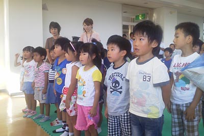 ひばりさんの持ち歌 「一本の鉛筆」(後記注参照)を思わせる挨拶だった。幼稚園児20人が立ち上がって、