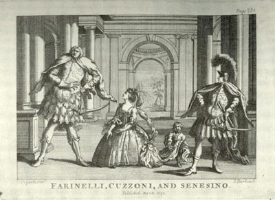 左端がファリネッリ(カストラート)、真ん中がクッツォーニ(女性ソプラノ歌手)、