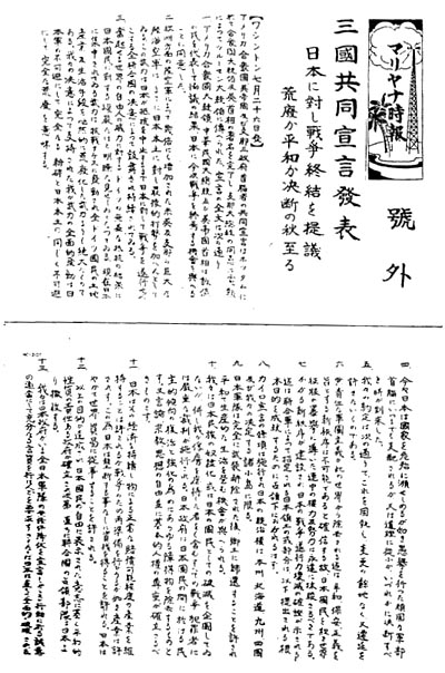 同宣言の内容と、その後の日米折衝経過を伝えるビラ (「マリヤナ時報」 号外)を作ったのはハワイの 「真珠湾収容所」 にいた日本人捕虜グループであり、